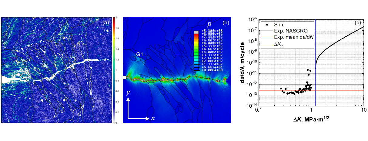(1)捕捉到了超高周疲劳早期的裂纹萌生/扩展过程。揭示了增材制造铝合金的VHCF裂纹萌生/扩展机理,建立了1:1还原实验的缺陷、晶粒织构和载荷条件的有限元模型。
