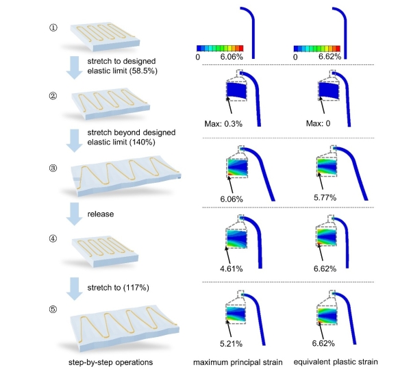 图2. 过加载策略的操作过程以及各过程中蛇形互联结构的应变分布