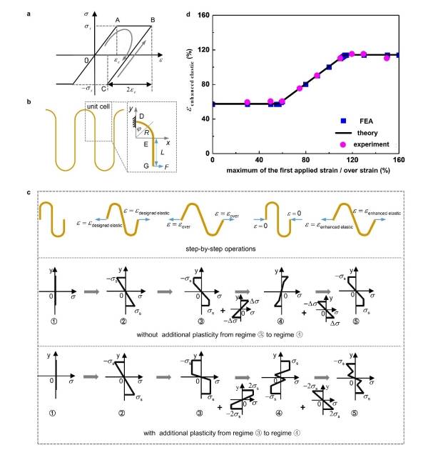 图3. 基于独立金属厚蛇形互联(MTSI)的过拉策略力学分析。(a)MTSI的本构关系:理想弹塑性;(b)MTSI的力学模型;(c)过加载操作过程示意图以及各过程中蛇形互联圆弧顶截面处应力分布。(d)MTSI的增强弹性延展性随第一次施加应变/过加载应变的变化,包括理论、有限元和实验结果
