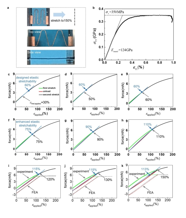 图4. 基于独立MTSI的过加载策略的实验验证。(a)独立MTSI初始状态的图像以及拉伸150%时的正面和侧面视图;(b)狗骨头形铜片的单向拉伸应力-应变曲线;(c-k)在第一次施加拉伸、卸载和第二次施加拉伸过程中,力与施加应变的关系曲线,第一次施加应变分别为:30%、50%、60%、75%、90%、110%、120%、130%、150%