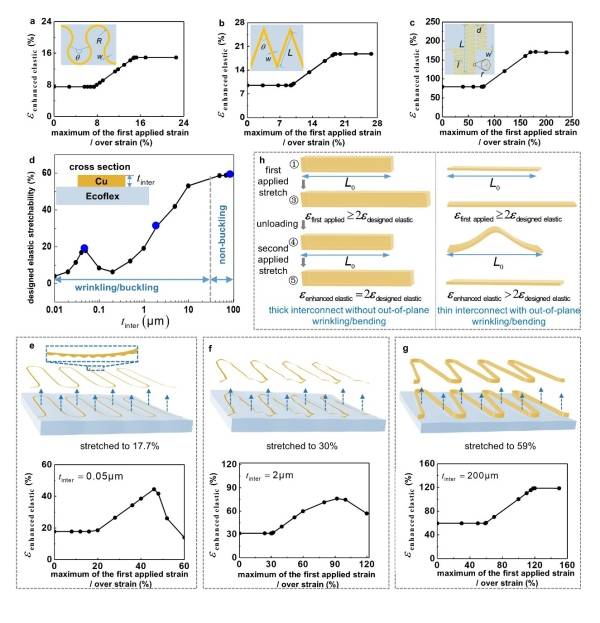 图5. MTSI粘结在软基底上的力学分析。(a-c)粘接在软基底上的厚马蹄形、之字形、分形互联的增强弹性延展性与第一次施加应变/过加载应变的关系;(d)粘接在软基底上蛇形互联结构的弹性延展性随其厚的变化关系;(e-g)三种不同厚度蛇形互连增强弹性延展性与第一次施加应变/过加载应变关系的有限元分析结果