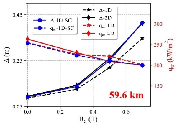 图1 磁流体一维驻点线计算结果对比,1D表示仅考虑洛伦兹力,1D-SC表示考虑激波曲面修正,2D表示二维数值模拟结果