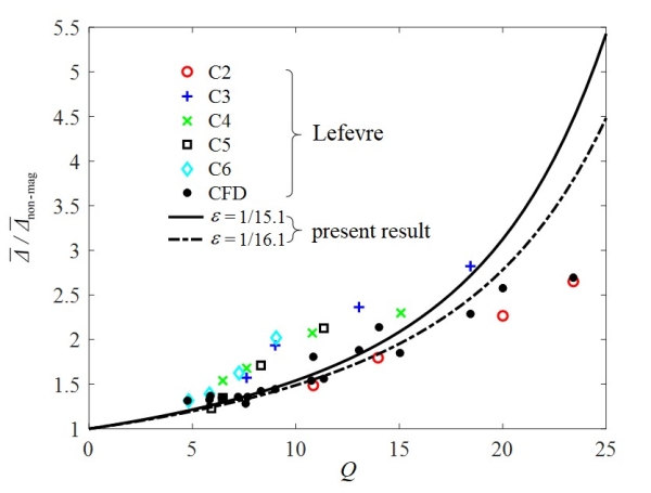 图2:MHD激波脱体距离理论求解,无量纲激波脱体距离与磁相互作用系数的关系曲线