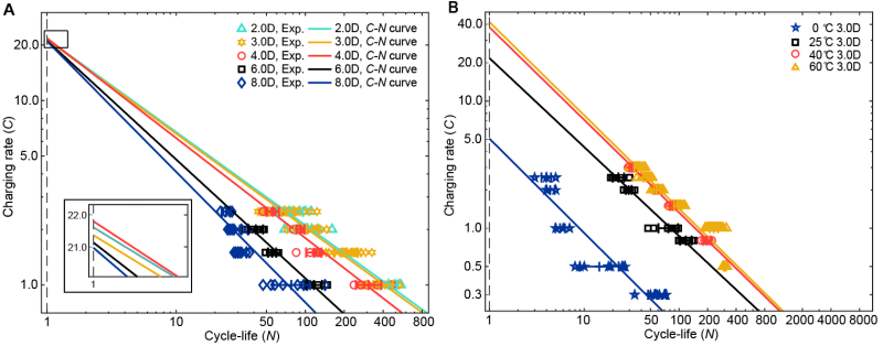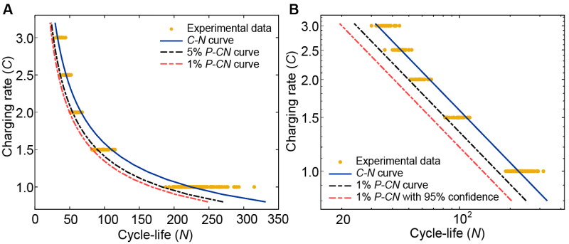 曲线是固体材料中疲劳可靠性分析与评价的经典准则。商用锂电池在循环服役过程中,同样面临寿命退化的问题。然而,锂电池寿命退化与固体材料的疲劳不同,其涉及复杂的力-热-电-化等多方面因素。如何精准刻画锂电池的寿命演化规律,是领域内长期困扰的科学问题。