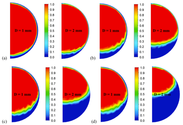 图4 1mm和2mm水平管内不同干度位置截面气液分布形态 (a) x=0.9; (b) x=0.7; (c) x=0.5; (d) x=0.3