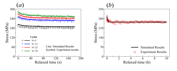 图1:模型与试验结果对比:(a)循环保载下不同循环周次的松弛曲线;(b)200周次低周疲劳后长时松弛曲线