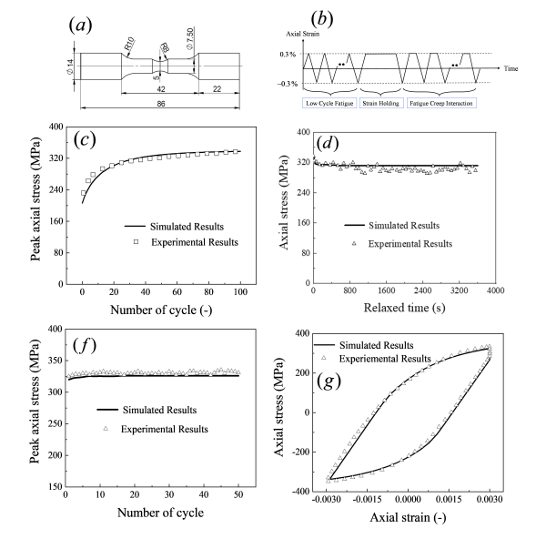 图2:缺口试样模型与试验结果对比:(a)试样尺寸;(b)加载条件;(c)低周疲劳阶段峰值应力演化;(d)长时保载阶段应力松弛;(f)循环保载阶段峰值应力演化;(g)循环保载阶段稳定时滞回曲线