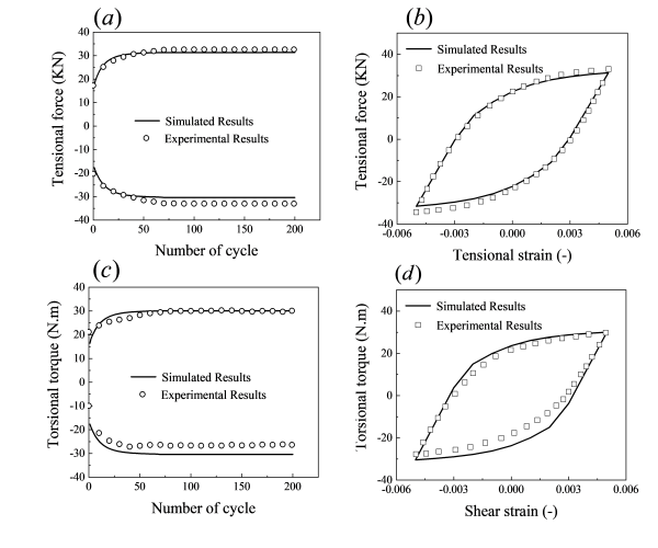 图3:循环拉扭加载模型与试验结果对比:(a)轴向加载峰谷值演化;(d)轴向稳定时滞回曲线;(c) 扭向加载峰谷值演化;(g) 扭向稳定时滞回曲线