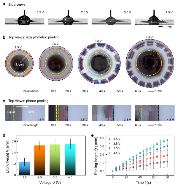 在本工作中,作者利用自行搭建的力-电耦合跨尺度实验平台研究了薄膜的电毛细剥离过程。研究结果发现:薄膜与基底黏附边界处的电解质溶液在垂直电场 (0.1-4.5 V) 的作用下会渗入薄膜与基底紧密结合的界面层中,并在该界面层中均匀、对称地扩展 (图1)。在电场不变时,电解质溶液向前扩展的速率基本恒定,直至实现薄膜从黏附基底的完全剥离。研究结果证明:一滴20 L的电解质液滴可实现半径约3 cm PDMS薄膜的剥离。