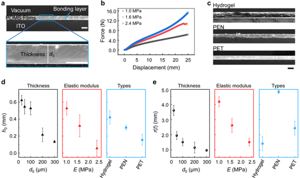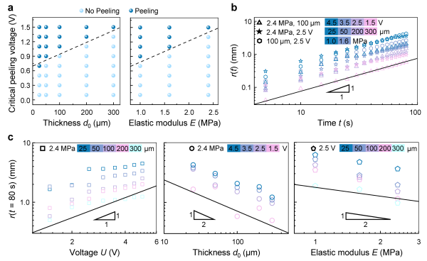 为了进一步探讨电毛细剥离方法的实用性,作者系统地研究了不同电场特性、溶液电性、薄膜属性(厚度和弹性模量)及薄膜类型下的电毛细剥离过程。实验结果发现,电毛细剥离方法可剥离多种类型的薄膜(如:水凝胶、PDMS、PEN和PET等)和适用于不同的电解质溶液(如:酸、碱、中性水溶液及有机溶液等),其剥离效率受施加电压、溶液电性、薄膜厚度、弹性模量及类型的影响,具有电场主动调控的特性 (图2和图3)。