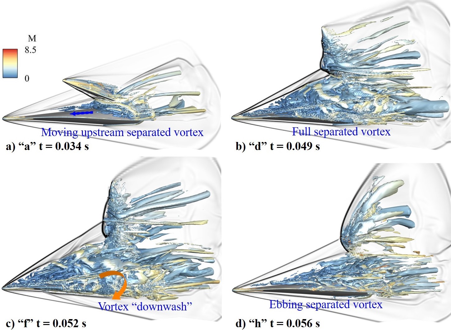 研究团队深入分析了轨道级质心位置对TSTO级间分离过程中的非定常气动干扰的影响,发现级间分离动态激波干扰主要以间隙内的多重-单重的黏性激波反射、流动分离产生的马蹄涡、I型和VI型激波干扰为主,弱激波干扰类型以及稳定的俯仰力矩奠定了安全分离的基础;发现了质心靠后时,助推级前缘(汇聚)激波-轨道级入射激波-边界层流动分离失稳(大尺度分离涡的传播和扩散运动)的正反馈流固耦合机制(图1和图2)。动态激波干扰的耦合机制双重放大激波干扰强度和流动失稳速率和大尺度分离涡运动范围,导致轨道级发生纵向翻滚以及助推级失去“乘波”特性并且气动力急剧变化,而分离失败(图3)。