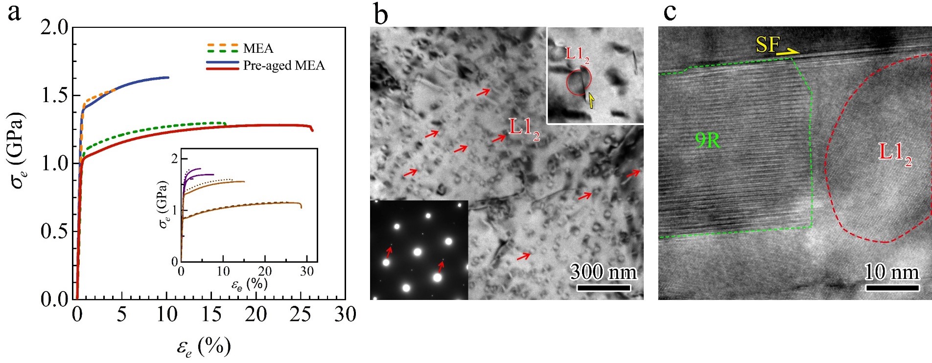 图1. (a)预时效处理与未处理的多组元合金的应力-应变曲线;(b) 预时效处理获得高密度共格纳米沉淀相及位错切过沉淀相;(c) 变形后位错、层错与沉淀相的交互作用。