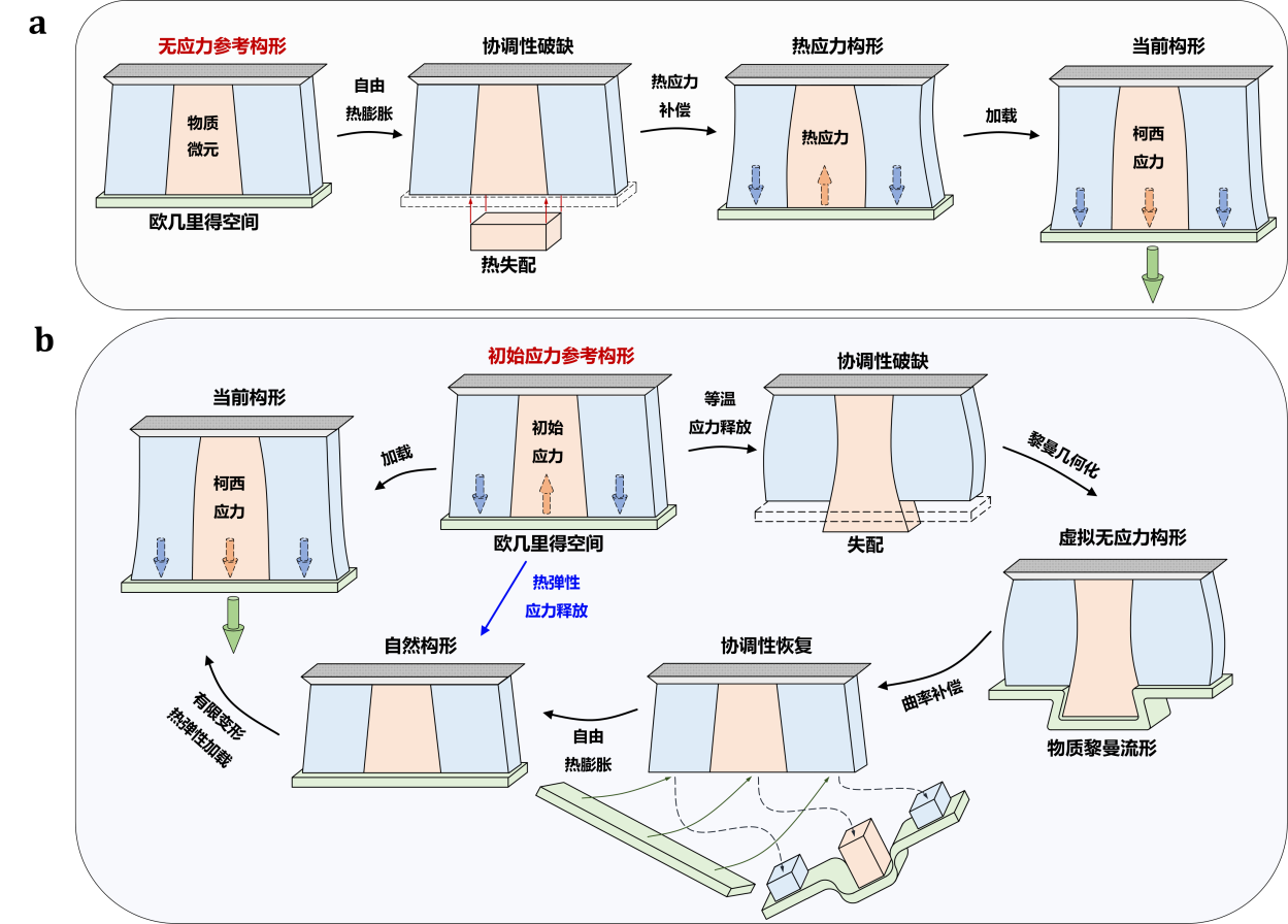 图1. (a) 经典热应力框架. (b) 协调性破缺—曲率补偿框架.