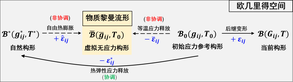 图2. 物质应变分解以及本构理论的黎曼几何化.