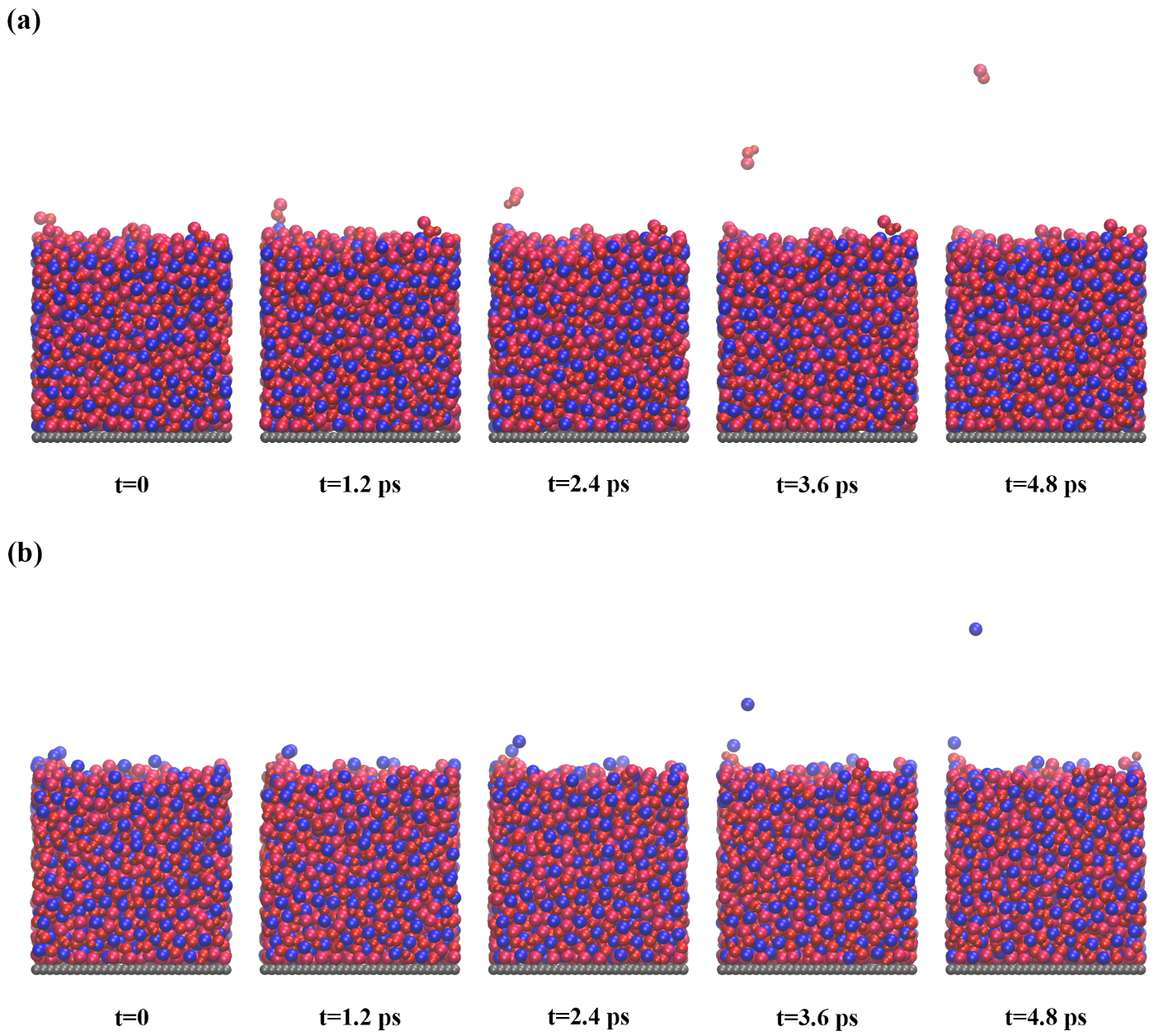 图1(a)阳离子喷射的模拟系统截图;(b)阴离子喷射的模拟系统截图