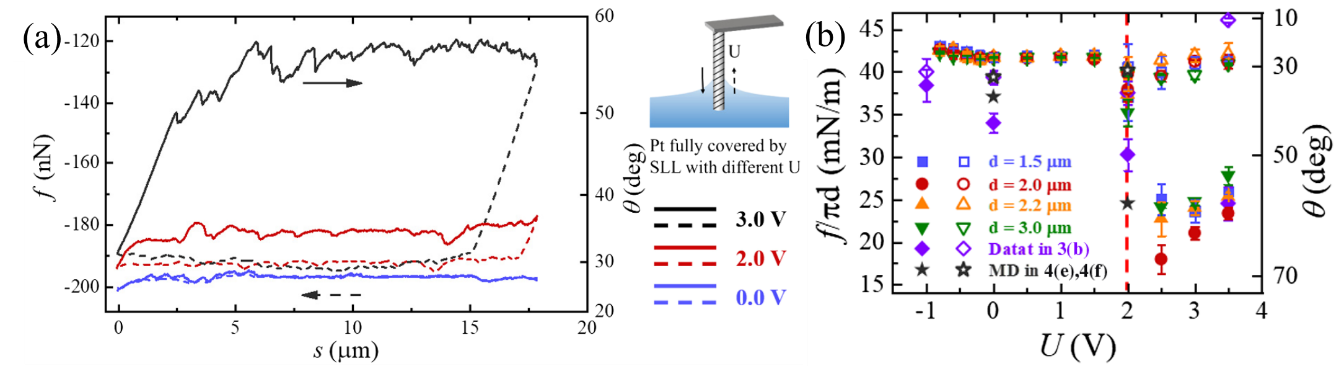 离子液体是一种完全由阴、阳离子构成的电解液,拥有较大的离子尺寸以及较强的离子间相互作用。其独特的物理、和化学性质,使得离子液体在摩擦、催化和储能等领域引起了广泛的关注。它一方面呈现流体的物质状态,另一方面在分子之间强库伦相互作用下呈现出熔盐的特质,这些独特的性质使得它的界面现象很难被传统流体或稀电解质理论所解释。它也是一种潜在的“活性”流体,界面行为受到表面能量和受限效应的调控。利用该特性,研究团队通过电场调控离子在AFM长针壁面上的排布,促使微观异质性增强,引起表面无序化和接触线钉扎效应,造成宏观接触角迟滞的增大,提供了由宏观毛细力表征微观界面离子排布的可行路径。研究中进一步通过分子动力学模拟展现了带电界面上由离子液体形成的类固体结构和能量的演化。综合实验和模拟结果给出了一种不同于传统电润湿的原理,通过电压调控离子液体界面离子排列和能量势垒,从而引起流体界面接触角迟滞转变的新机制。
