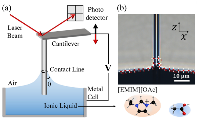 “如何在微观层面测量界面现象”被列入世界前沿125个科学问题名单。长期以来,研究者不断发展新的理论和实验手段来研究界面问题,试图揭示界面上复杂现象的物理本质以及微观层面的分子行为与宏观现象间的关联机制。近日,Q彩网微纳米流体力学研究团队,利用独特设计的长针式原子力显微镜(Long-needle AFM),建立了能够在气液固三相界面上的精确操控和小尺度力学测量的实验平台,实现了离子液体在金属壁面离子排布和接触角迟滞的测量和调制。相关研究成果以“Manipulation of Contact Angle Hysteresis at Electrified Ionic Liquid-Solid Interfaces”为题发表在《物理评论快报》(Physical Review Letters)上。