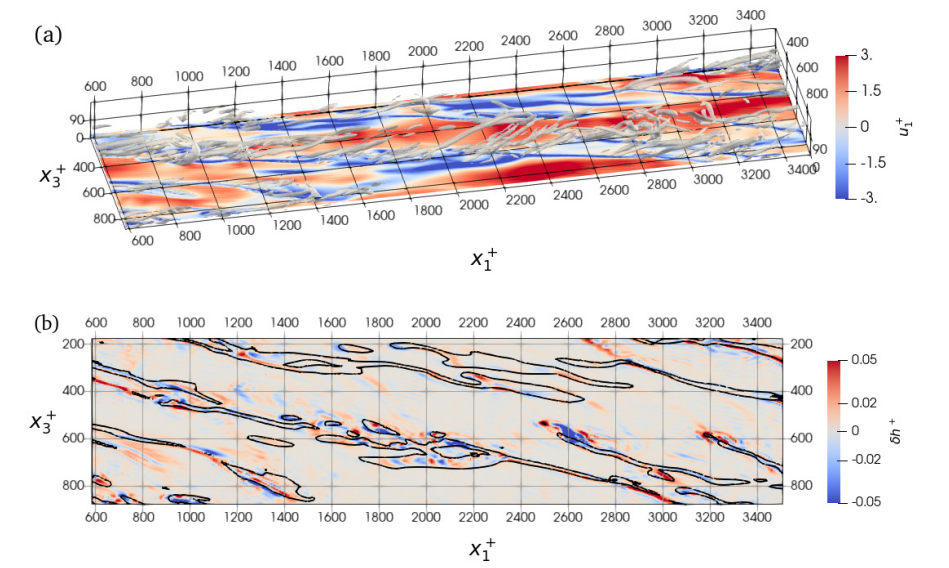 (a)条带与涡结构分布;(b)条带与小尺度螺旋度分布