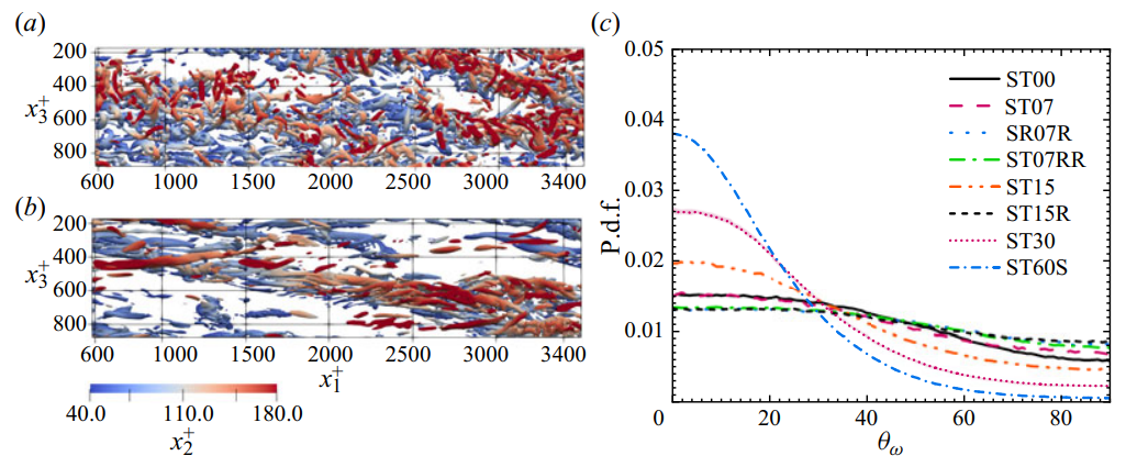 图2 旋转抑制了展向涡的发展,从而抑制了扫掠事件与湍流的进一步演化