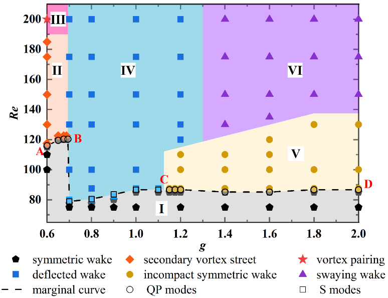 图2参数空间(g, Re)上的尾迹类型分布I:稳定对称尾迹;II:二次涡街;III:涡对并后二次涡街;IV:倾斜涡街;V:对称性可恢复尾迹;VI:双股同相摆动涡街