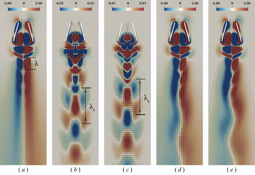 通过Floquet全局稳定性分析,他们发现对称破缺发生的根源在于一个反对称Floquet模态失稳(如图3所示)。Floquet稳定性分析的结果能够很好地预测图2中的临界稳定中性线位置以及不同的尾迹失稳类型。他们还进一步采用动力学模态分解(DMD)方法,分析了求解N-S方程得到的对称破缺初步阶段的流场数据。DMD分析指出的对称破缺机理与Floquet稳定性分析的结果完全一致。