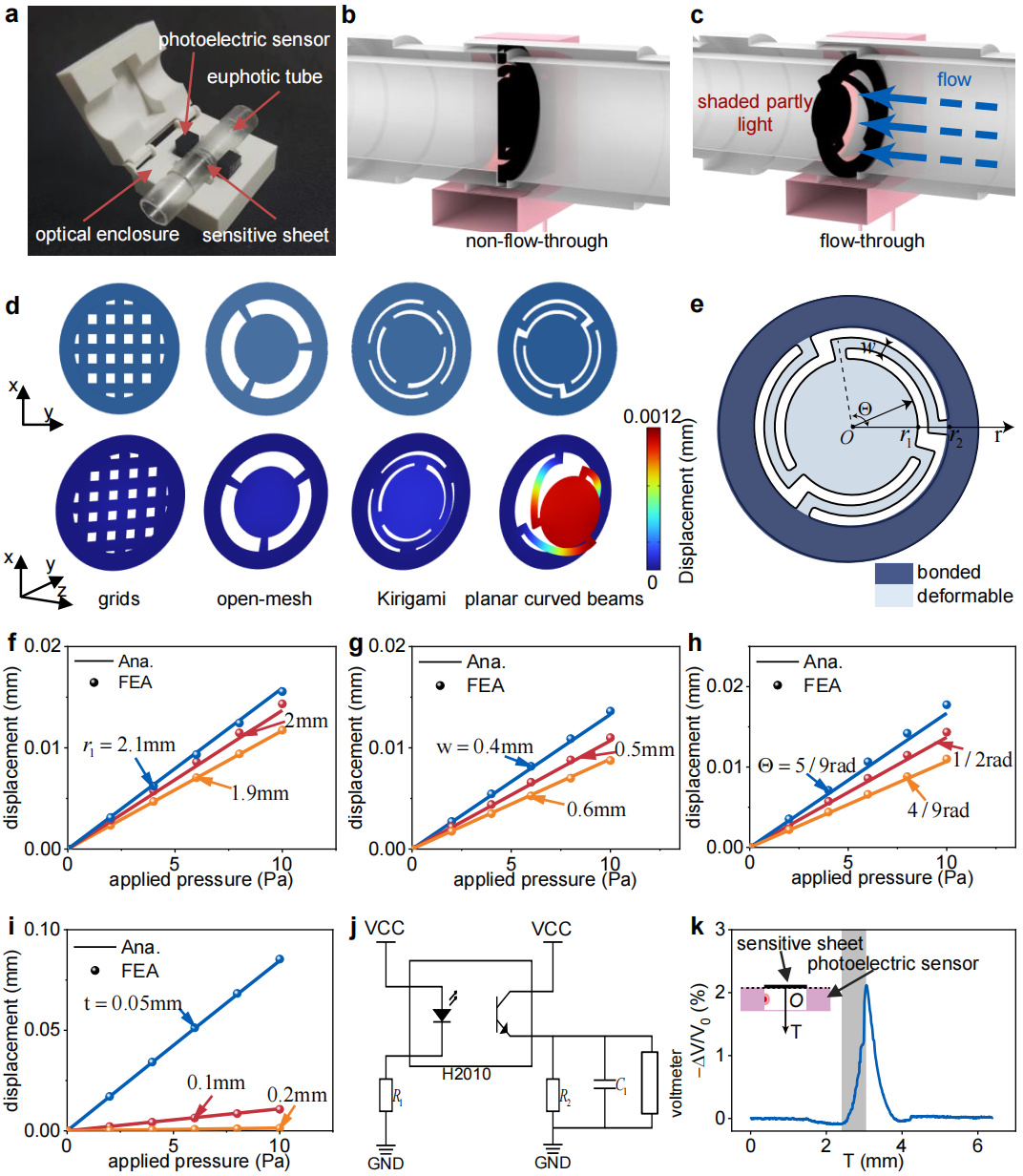 图2基于FPCBS的光电式流速传感器的基本传感性能和原理。(a)基于FPCBS的光电式流速传感器光学图像。(b)无流体流动时,敏感薄片相对于红外光路的状态。(c)流体流动时,敏感薄片相对于红外光路的状态。(d)通过有限元方法比较了四种不同柔性大变形结构薄片的轴向位移。(e)所提出的FPCBS的力学几何模型。(f)在相同压力下参数r1对位移的影响。(g)在相同压力下参数w对位移的影响。(h)在相同压力下参数θ对位移的影响。(i)在相同压力下参数t对位移的影响。(j)所设计的流速传感器的外围电路。(k)对薄片位移的电学响应。