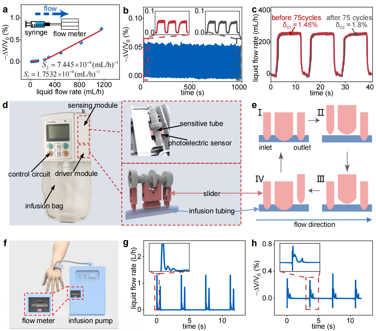 图4流速传感器检测液体流速的性能和应用。(a)流速传感器的相对电压变化与流体流速的关系。(b)在液体流速为250mL/h下反复加载和卸载75个循环时的相对电压变化。(c)循环加载中的前三个周期和后三个周期的耐久性误差比较。(d)配有流速传感器的商用电子输液泵示意图。(e)商业输液泵滑块的运动模式。(f)将流速传感器应用于商用输注泵。(g)商用流速传感器对输注泵的响应。插图:一个周期内的输出信号。(h)所提出的流速传感器对输注泵的电学响应。插图:一个周期内的两个峰值。
