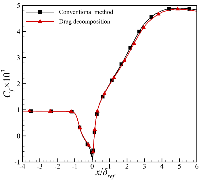 图3 壁面摩阻系数流向分布。黑线和红线分别为常规方法和分解方法计算结果