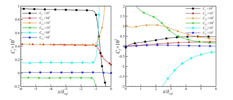 在上游边界层,粘性耗散和湍动能生成为摩阻的主要贡献项,法向对流项表现为负贡献,这是由于边界层的发展随着带来正的法向速度。在干扰区,多个分量值超过总摩阻Cf,其中粘性项、湍流项和法向对流向产生正贡献。干扰区密度和雷诺应力增强,使得湍流项增加;密度和下洗强度增加,致使法向对流项增加;密度加权下洗强度大于时间平均下洗强度,而Cf,C与密度加权速度下洗速度有关,表明压缩性使得下洗引起的Cf,C进一步增加。