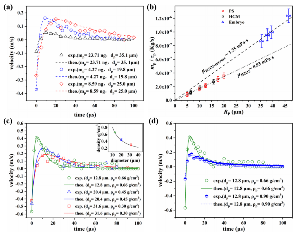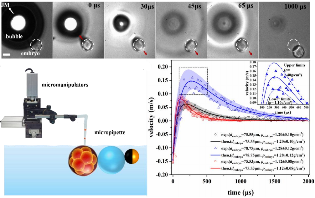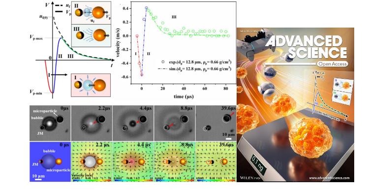 图1. 本研究基于Bubble Microthruster对目标颗粒施加瞬时惯性冲击,发展了亚纳克精度胚胎质量/密度实时、便捷测量的新技术。气泡微推进的三阶段特性(左图),可利用目标颗粒对气泡产生的惯性射流冲击的响应,尤其是对第二阶段瞬时射流冲击(蓝色)以及第三阶段速度衰减(绿色)的实验结果拟合可以确定颗粒的弛豫时间,并由此测量胚胎等颗粒的质量或密度。结果作为封面文章发表于Advanced Science (右图)