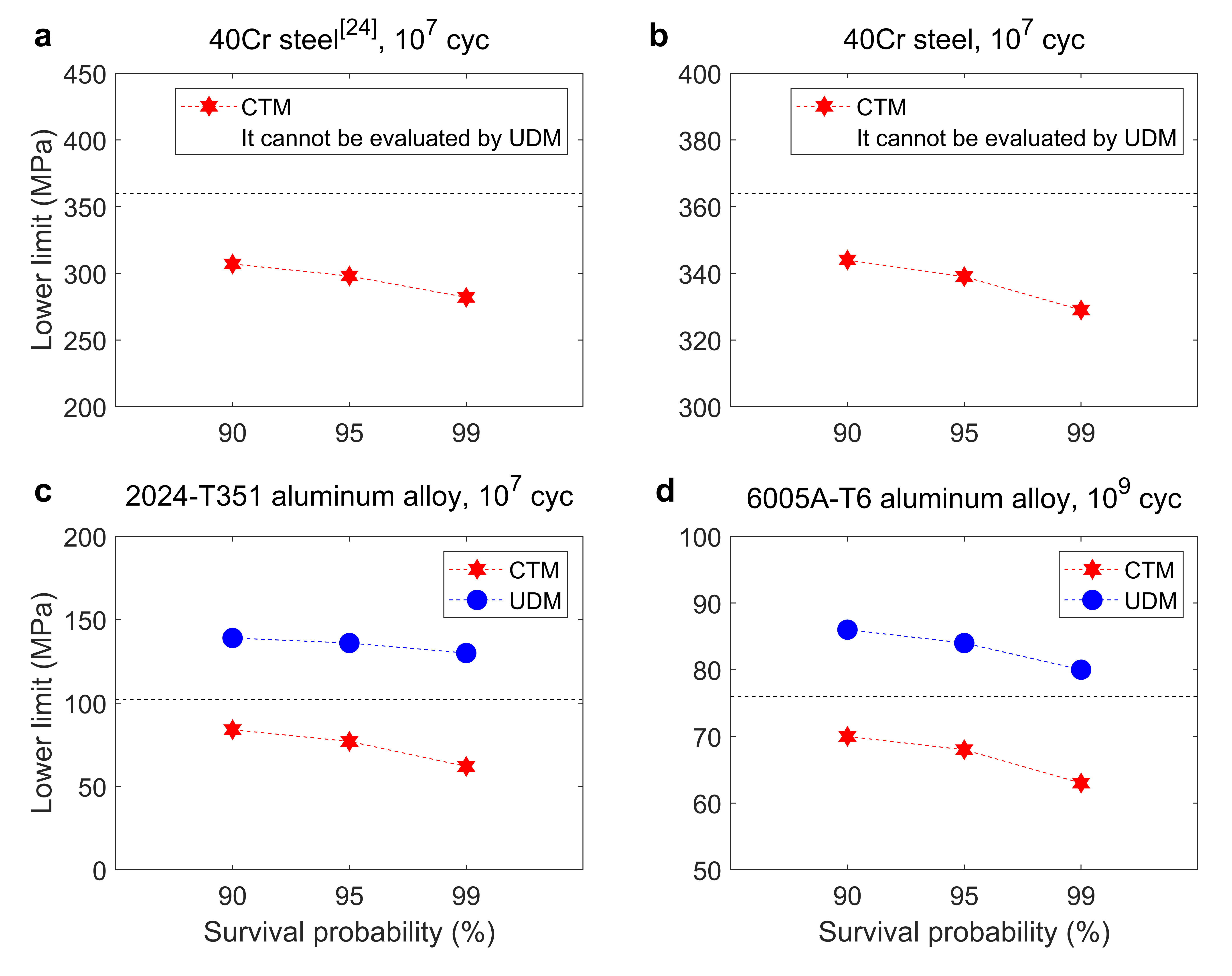 图2 CTM方法和UDM方法评估的疲劳强度对比,虚线表示测试的样品中发生失效的最小应力水平
