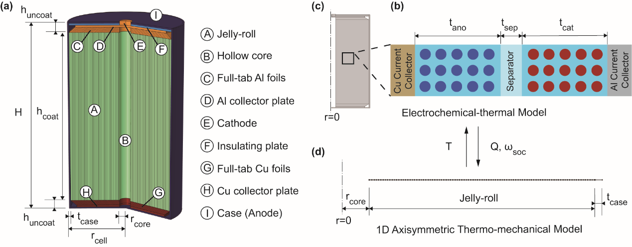 图1.(a)大尺寸全极耳圆柱电池示意图,(b)伪二维电化学模型,(c)二维轴对称传热模型,(d)一维轴对称热力耦合模型