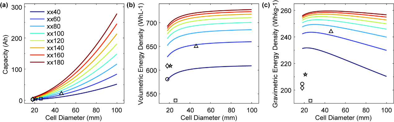 图2.圆柱电池能量特性随尺寸的变化规律(a)理论容量,(b)体积能量密度,(c)质量能量密度