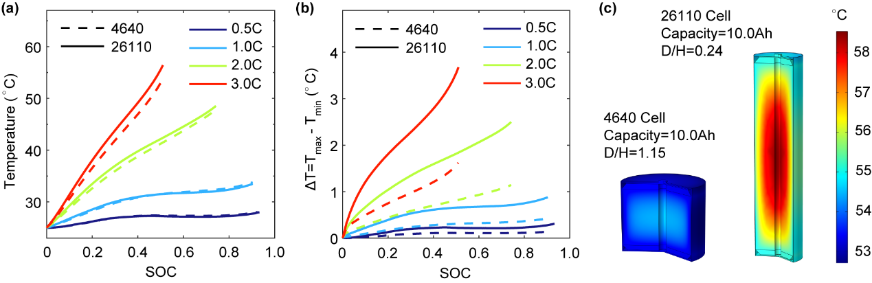 图3.不同充电倍率下4640与26110电池的温度演化(a)电芯平均温度,(b)电芯温度梯度,(c)电芯内部温度分布云图