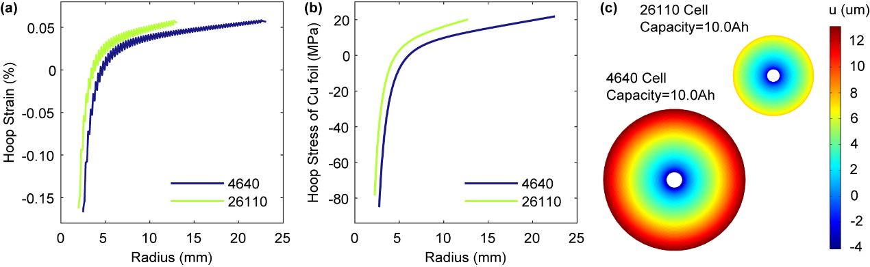 图4.满充状态下4640电池与26110电池的内部应力应变(a)电芯各层环向应变,(b)负极集流体铜箔的环向应力,(c)电芯内部径向位移云图