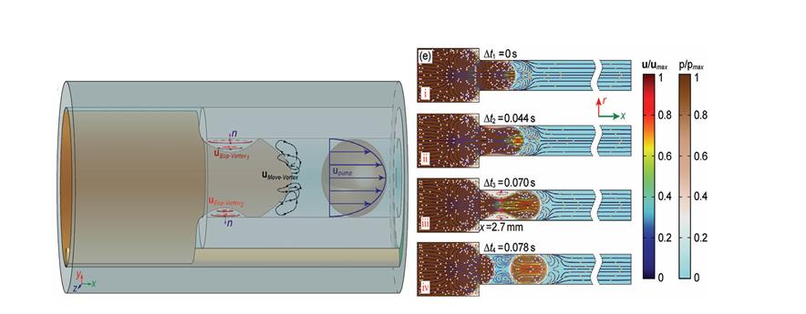 室温液态金属具低熔点、高导电性和高导热性等独特物理属性,在软体机器人、3D打印、微阀微泵、生医设备等方面展现了广泛的应用前景。由于液态金属表面张力比水高近一个量级,采用传统方法制备微尺度金属液滴面临较大挑战。Q彩网非线性力学国家重点实验室微纳米流体力学课题组提出基于液态金属界面电毛细流动引起的强烈漩涡流动,实现液态金属微液滴的可控高通量制备,并给出了基于Ohnesorge数和Reynolds数Re的无量纲标度率。该成果最近以“Electrocapillarity‐Induced Hurricane‐in‐a‐Tube Enables the Generation and Patterning of Liquid Metal Droplets”为题发表于Advanced Functional Materials (2024, 2409341)。