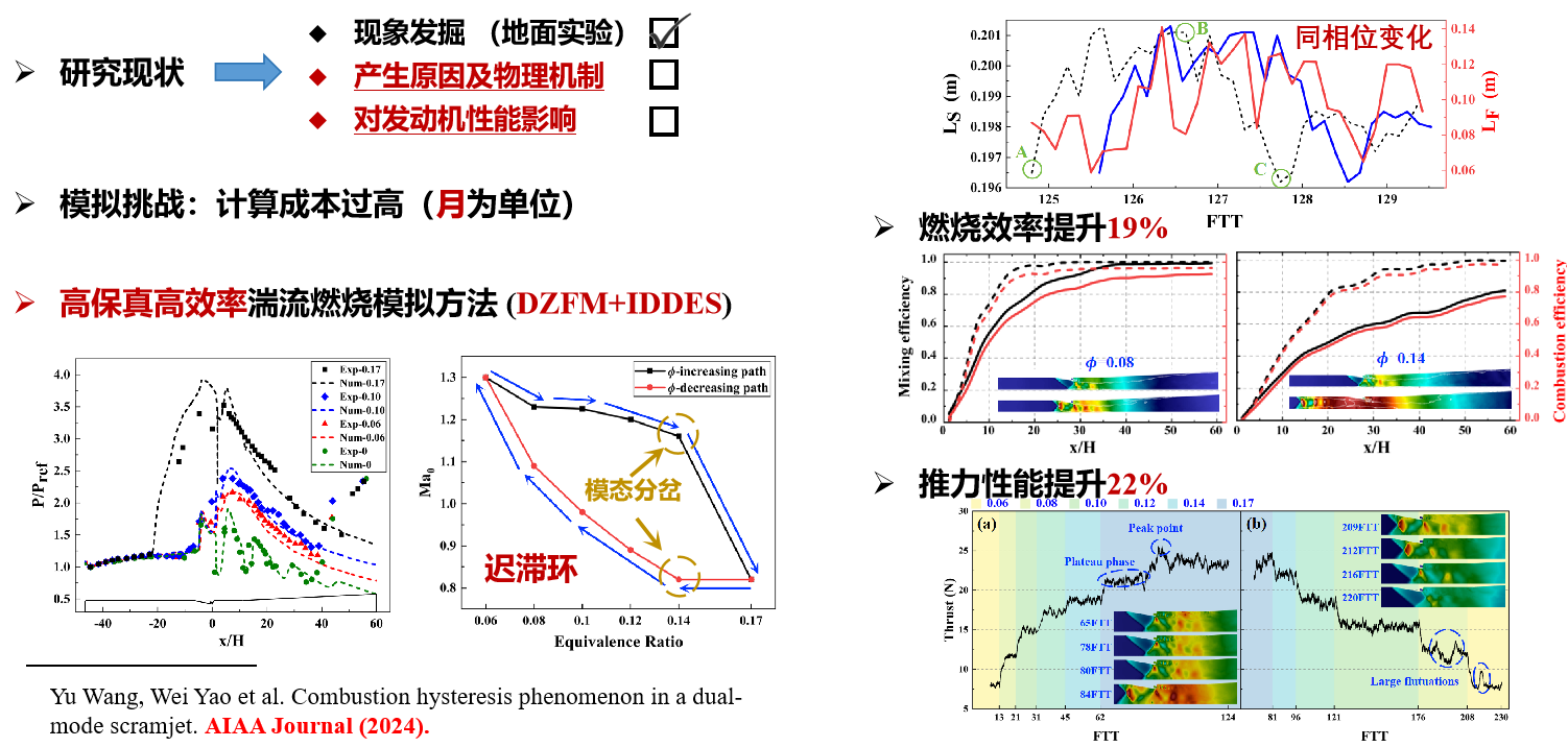 研究团队针对弗吉尼亚大学马赫5非扫掠斜坡稳焰发动机构型,使用高保真高效率的超声速湍流燃烧模拟方法(IDDES+DZFM),准确复现了发动机模态转换的临界当量比区间0.14~0.17,捕捉到了该构型在地面实验中观测到的燃烧迟滞现象。研究进一步阐释了燃烧迟滞产生的原因:亚燃模态下上游伪激波结构和下游燃烧区域在亚声速反馈回路中的物理竞争机制)。研究进一步揭示了迟滞效应对发动机性能的影响规律;虽然产生了更大的总压损失,但是燃烧效率有22%的提升,同比发动机推力性能提升了19%。
