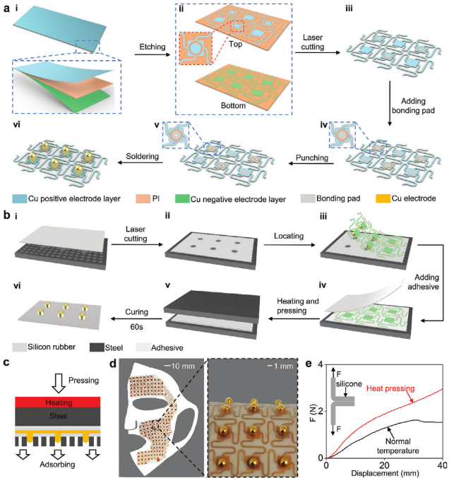 图1. SEFM-RFT的设计和制造:a)SEFM-RFT的柔性电路部分的制造过程。b)基于AHPP技术的封装过程。c)AHPP技术原理示意图。d)SEFM-RFT的光学图像和封装后内表面形态。e)AHPP技术和传统室温封装技术的T型剥离实验和粘合强度比较