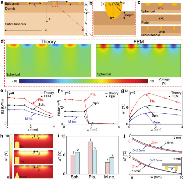 图2. SEFM-RT模型:a)模型示意图。b)椭圆电极及其与皮肤组织的相互作用示意图。c) 电极形状变化的原理示意图。d)模型解析结果和FEA之间的电压场分布比较。不同形状电极的模型解析结果和FEA之间e)电场强度,f)能量损失,以及g)温度变化的比较。h) 不同形状电极对皮肤加热的云图展示。i)电极形状对加热效果的影响。j)电极的大小和距离对加热效果的影响