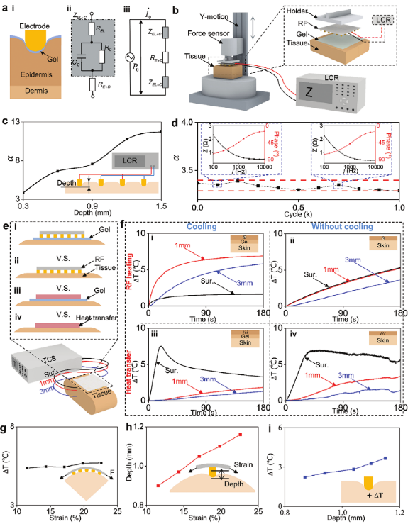 图3. SEFM-RFT的力学、热学和电学特性:a)电极-皮肤电阻模型及其等效电路模型的示意图。b)电极压痕深度对电极-皮肤阻抗影响的实验示意图。c)电学参数随电极压痕深度的变化。d)电极阵列样本的30%拉伸疲劳实验,重复1000次。e)射频加热和热敷加热效果比较的实验示意图。f)射频加热和热敷加热效果比较。g)SEFM-RFT在曲面下射频加热的稳定性。h)曲面下SEFM-RFT电极压痕深度与其变形之间的对应关系。i)电极压痕深度与射频加热温度之间对应关系