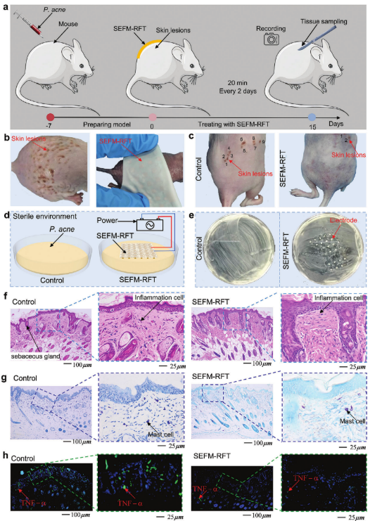 图4. SEFM-RFT治疗痤疮疾病的有效性:a)动物实验过程的示意图。b)痤疮诱导的小鼠模型和使用SEFM-RFT治疗小鼠示意图。c)对照组和使用SEFM-RFT射频治疗治疗组的治疗效果比较。d)对照组和SEFM-RFT治疗组抑制痤疮丙酸杆菌的对比实验。e) 对照组和SEFM-RFT治疗组之间痤疮丙酸杆菌生存状态的比较。f)对照组和SEFM-RFT治疗组动物组织的组织学切片。g)对照组和SEFM-RFT治疗组动物组织的甲苯胺蓝染色。h)对照组和SEFM-RFT治疗组动物组织的免疫荧光染色