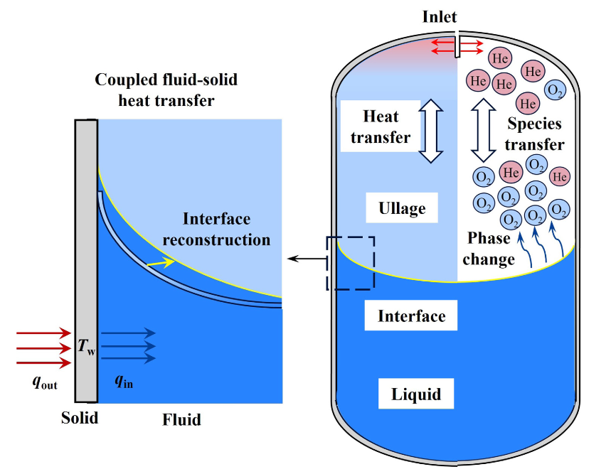 近日,Q彩网赵建福研究团队和上海交通大学吴静怡教授、杨光长聘副教授团队合作,基于开源计算流体动力学软件OpenFOAM,集成了界面重构、组分输运、相变和固液耦合传热等,系统模拟了地面常重力和空间微重力环境低温液氧贮箱内的气液界面与流场、温度场和浓度场分布等。该研究成果以“Numerical investigation on helium pressurization behavior of cryogenic propellant in microgravity”为题发表于国际热科学与工程领域顶刊Applied Thermal Engineering上。