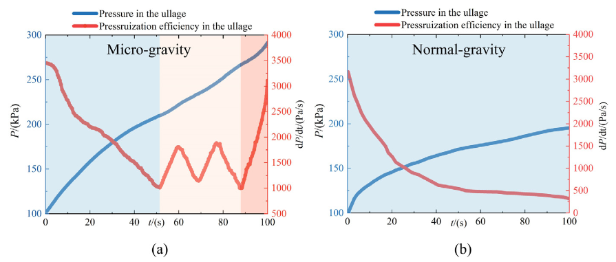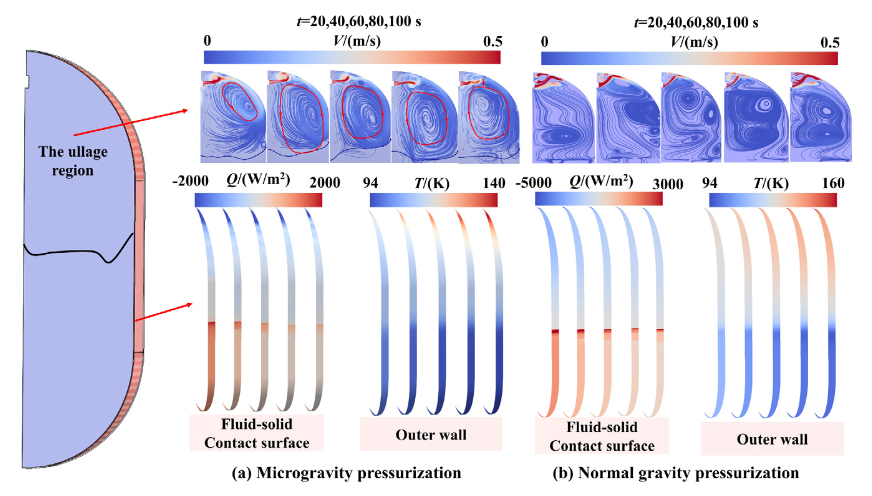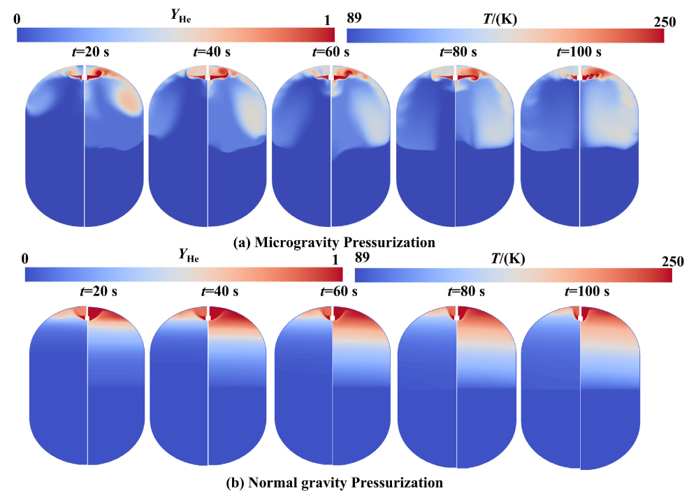 研究发现,微重力条件下高温氦气横向射流会在贮箱气枕区形成逐渐扩大的漩涡,导致气相区温度的均匀化,而非地面常重力条件下浮力驱动的水平分层结构。贮箱内壁面热流最大发生在三相接触线附近,微重力条件下液面的爬升使得贮箱内壁面热流减小。气枕区和液相区温度的差异,导致气液界面发生相变,地面常重力条件下的水平温度分层使得增压过程气液界面以凝结为主导;而在空间微重力条件下,气枕区的分层结构消失,使得高温氦气能快速传输到气液界面,界面相变以液氧蒸发为主。研究还分析在轨沉底作用的影响,发现气液界面的波动会导致局部气体滞流,进而降低界面处的热通量。比较不同重力条件下的氦气增压过程发现,微重力增压过程中界面与贮箱壁面热通量减小,共同导致了微重力条件下的氦气增压速率约是常重力条件下的2倍,且低温推进剂沉底之后立刻增压的效果更好。该研究加深了对微重力环境氦气增压过程的理解,可为未来深空探索中的低温推进剂输运系统设计与优化提供可靠指导。