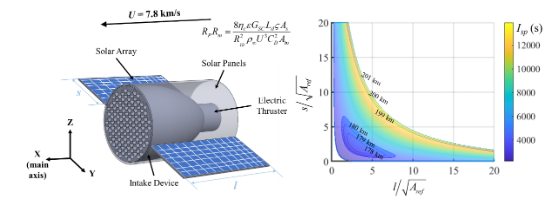 极低轨道(100-250公里)空域作为新兴战略空间,在国防安全、经济建设与科学探索中具有重要战略价值。极低轨飞行器兼具发射成本低、观测分辨率高、通信时延短等显著优势;但其特殊的大气环境特性,如时空涨落明显、原子氧影响显著等,对飞行器的构型、动力、能源等方面提出了严苛的要求,因此吸气式电推进飞行器构型设计需要平衡取舍、系统寻优。研究团队开展了吸气式电推进飞行器的构型设计工作,相关成果以“Structural and Configurational Optimization of Spacecrafts in Very Low Earth Orbit using Atmosphere-Breathing Electric Propulsion”为题发表在《Acta Astronautica》期刊上。