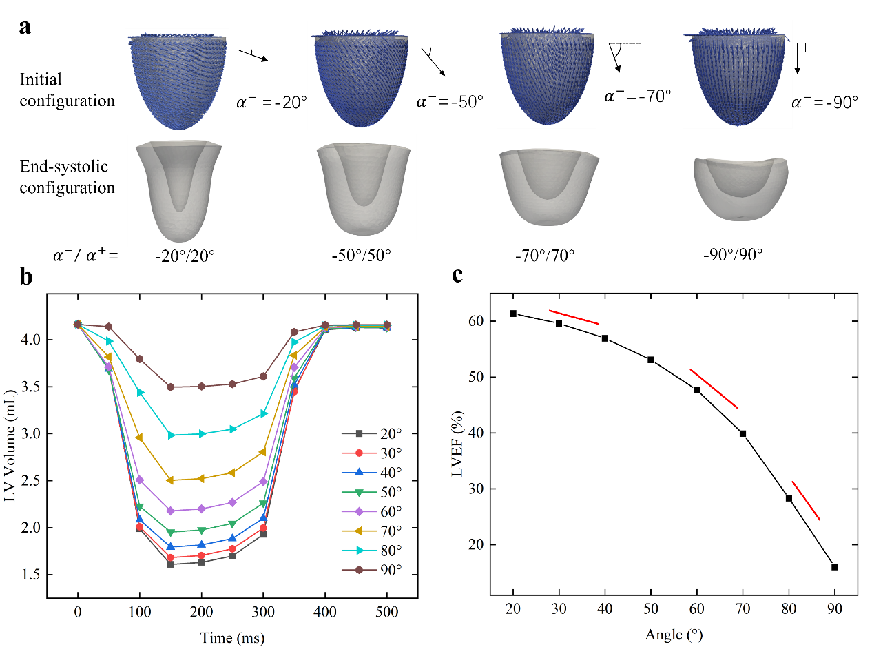图2. 心肌纤维取向角对左心室收缩行为的影响