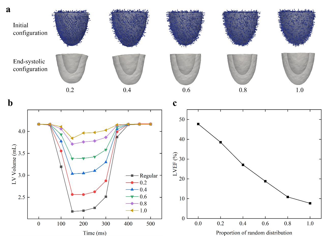 研究团队发现,当心肌纤维的螺旋角从20°增加到90°时,射血分数(EF)从62%急剧下降至15%,收缩末期容积扩大了2.3倍。这一结果证实,较小的心肌纤维螺旋角更有利于心脏的高效泵血(见图2)。基底区(靠近心房部位)的心肌纤维紊乱对射血分数的影响较大(减少达8.3%),而心尖区的纤维紊乱对射血分数几乎没有影响。这一发现揭示了不同区域心肌纤维排列对心脏功能的重要性差异(见图3)。对于紊乱心肌纤维随机分布的情况,射血分数随紊乱心肌纤维比例呈线性降低的特征,在心肌纤维完全紊乱的情况下,射血分数仅剩8%(见图4)。