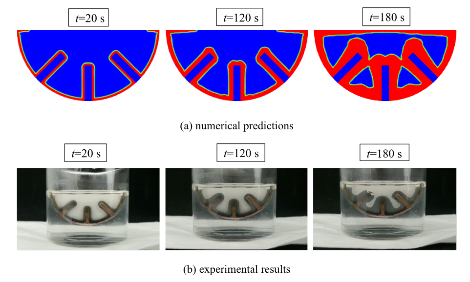 图2 地面常重力条件下矩形鳍片PCM动态融化过程数值仿真与实验观测结果的比较