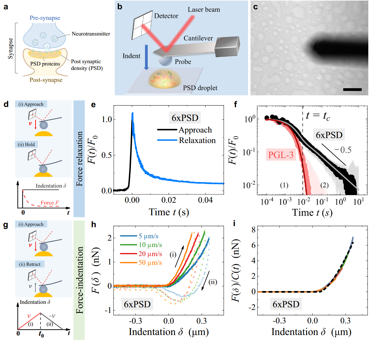 蛋白质和RNA等生物大分子通过多价弱相互作用发生相分离,形成具有动态特性的液态聚集体。这些凝聚体能够在细胞内对多种生命活动进行精确的时空调控,其进一步发生的力学变化是阿尔兹海默症等神经退行性疾病的致病机制。然而,以往研究多集中于由单组分或简单多组分生物大分子形成凝聚体的生化特性,其力学行为通常符合经典麦克斯韦流体模型。真实细胞环境中的生物相分离凝聚体常由多价蛋白质通过复杂相互作用形成动态网络,其力学特性可能远超现有模型的描述范围。如何解析这类复杂液态凝聚体的力学行为及其分子机制,成为领域内的重要挑战。近日,力学研究所关东石研究员与香港科技大学童彭尔教授及南方科技大学张明杰院士等联合团队,利用原子力显微镜(AFM)介观流变学与定量荧光测量技术,首次系统解析了由6种突触后蛋白(6xPSD)重构的功能性凝聚体的涌现力学特性,揭示了其动态交联网络的力学松弛规律及生理意义。相关成果以“Emergent mechanics of a networked multivalent protein condensate”为题发表于《Nature Communications》。
