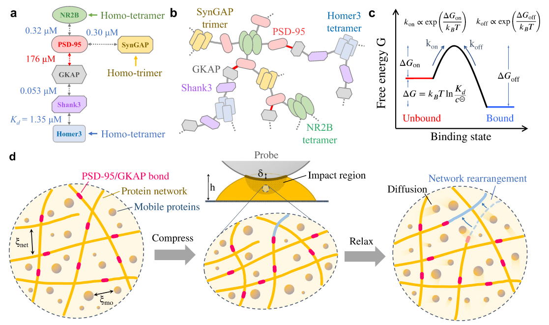 研究团队通过构建由6种突触后蛋白组成的凝聚体,首次揭示了多组分和多价蛋白质凝聚体中超越传统简单组分凝聚体(如PGL-3,单一指数松弛)的力学特性。通过AFM力学弛豫和压痕实验,研究团队发现多价功能蛋白质凝聚体具有独特的双模式力学松弛机制——由蛋白扩散主导的短时指数衰减和由网络动态重构主导的长时幂律衰减(图1)。进一步的荧光漂白恢复(FRAP)、荧光定量(FIQ)和离心实验表明,凝聚体中80%的蛋白质可自由扩散,而剩余20%的支架蛋白可形成动态交联网络(图2)。这一网络通过最弱键(如PSD-95与GKAP的结合,解离常数Kd =176 μM)的解离动力学调控幂律松弛,揭示了生物凝聚体力学行为的分子基础。动态网络赋予凝聚体类似“软玻璃态”的力学特性,既能通过自由扩散蛋白快速响应机械刺激,又能通过缓慢的网络重组维持结构稳定性,为突触可塑性提供了可能的力学解释(图3)。 该研究不仅为解析复杂液态生物凝聚体的力学特性建立了实验与理论框架,还为相关疾病机制研究提供了新思路。