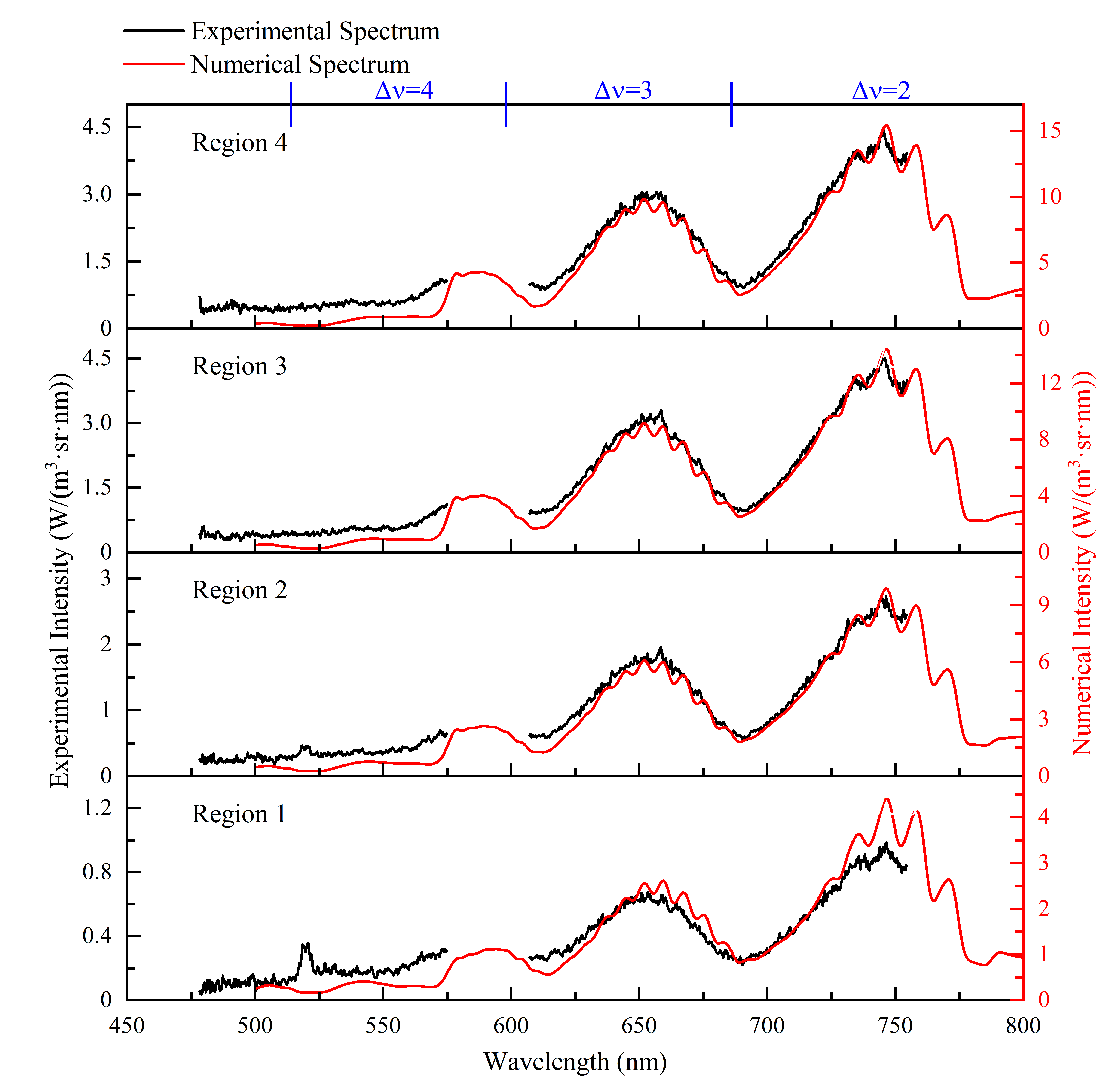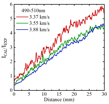 氮气实验结果显示,钝头模型的肩部膨胀区辐亮度高出计算值3–4倍;模型近壁区存在由N(2D)–N(4S)跃迁产生的520 nm原子线,说明流动中存在着被显著低估的预解离机制。二氧化碳实验结果,模型尾部膨胀区呈现由CO2化学发光与O2 Schumann–Runge带系共同主导的辐射机制。其中化学发光在膨胀区的计算和实验强度比值在0.5-6间变化;O2的Schumann–Runge带系强度远高于双温度模型假设下的计算值,表明了膨胀区存在着过量激发态氧分子O2(3B)。